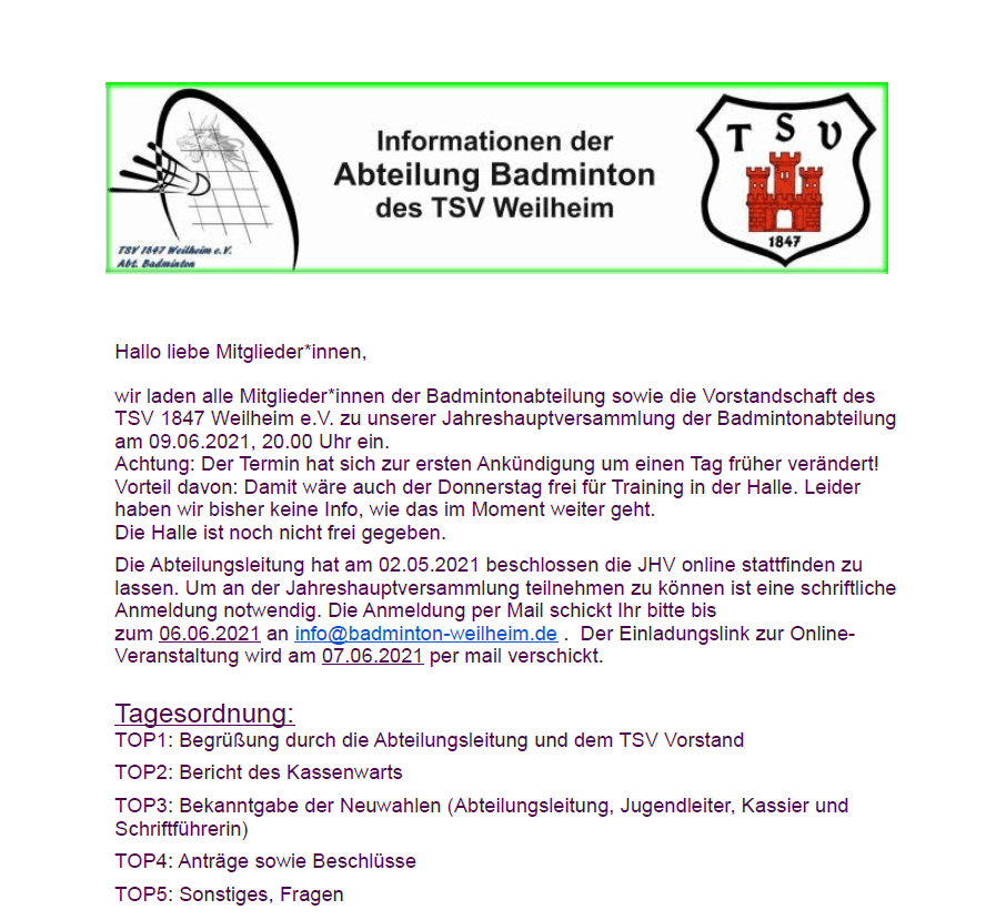 Badminton: Einladung zur Mitgliederversammlung am 09. Juni 2021