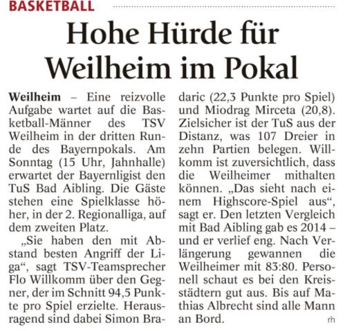 Hohe Hürde für Weilheim im Pokal