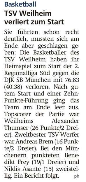 Basketball: TSV Weilheim verliert zum Start
