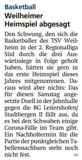 Basketball: Weilheimer Heimspiel abgesagt