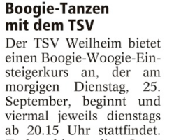 Am Sonntag, 21.10.18 bietet die Rock´n´Roll- und Boogie-Abteilung Lindy Hop Workshops an. Von 13.45 Uhr bis 15.15 Uhr für Einsteiger im Lindy Hop – Kosten EUR […]