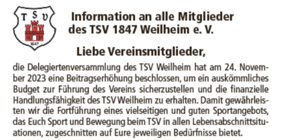 Views: 1Liebe Vereinsmitglieder, die Delegiertenversammlung des TSV Weilheim hat am 24. November 2023 eine Beitragserhöhung beschlossen, um ein auskömmliches Budget zur Führung des Vereins sicherzustellen und […]