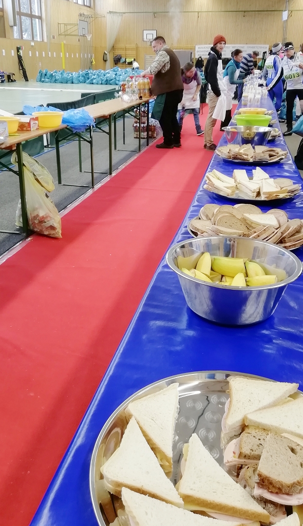 Jeder Teilnehmer konnte sich nach dem Rennen im Ziel in der 3-fach-Turnhalle des TSV Oberammergau an einem sagenhaften Buffet stärken. Nudeln mit Tomatensoße, belegte Käse- und Wurstbrote, heiße Brühe, Käseecken, Kraftriegel, Orangen- und Bananenstücke, alle Arten von Getränken bis hin zum Bier konnten genossen werden und es herrschte ein interessantes sportliches Lagerleben.