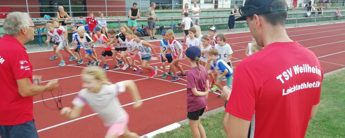 5. Wurf (6-17 Jahre Ballwurf, ab 18 Jahre Medizinballwurf). Alle lizenzierten Sportabzeichenprüfer des TSV Weilheim waren an diesem Nachmittag bei uns, so dass auch alles "amtlich" ablief. Dieses Sportabzeichenangebot haben 56 Kinder und Jugendliche wahrgenommen! Bei 35 Grad im Stadion war alleine schon das Kommen eine reife Leistung.