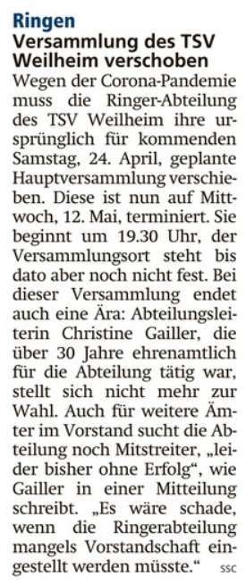 Ringen: Versammlung des TSV Weilheim verschoben