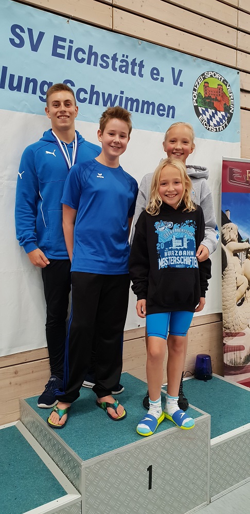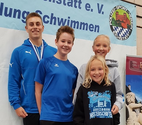 Moritz Hoffmeyer, Lukas Parockinger, Carolina Seitz und Elisabeth Seitz durften am 20./21.10.2018 nach Eichstätt zur Oberbayerischen Kurzbahn-Meisterschaft des Bayerischen Schwimmverbands fahren. Sie hatten sich in den Schwimmwettkämpfen des vergangenen Jahres qualifiziert. Allein die Teilnahme war also ein schöner Erfolg für den TSV-Nachwuchs .... der dann in Eichstätt überzeugende Leistungen zeigte.
