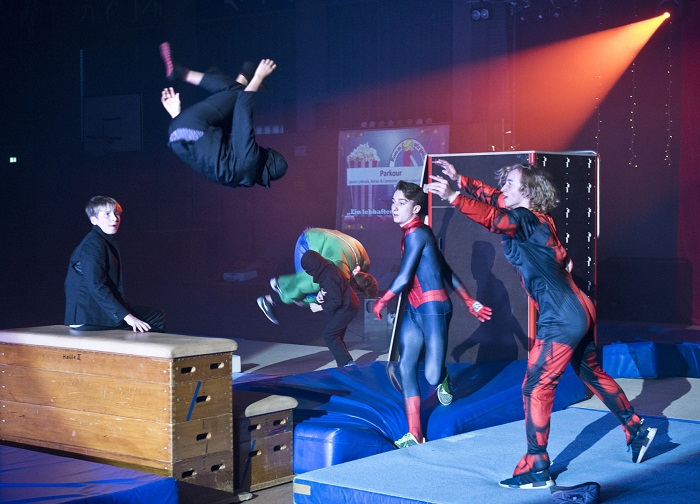 Die Parkour-Gruppe zeigte eine spektakuläre Show unter dem Motto "Ein lebhafter Filmabend". Zur Filmmusik von James Bond präsentierten die Jungs verschiedene Saltivariationen über Kästen sowie an der Parkourbox.