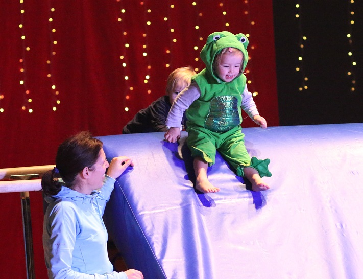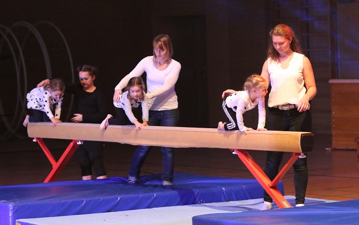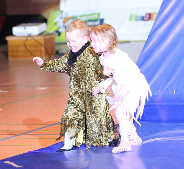 Den Anfang der Show machte die Eltern-Kind-Gruppe. Die Kleinsten an der Hand von Mama und Papa eröffneten den Nachmittag zum Kinderfilmklassiker "Dschungelbuch". Die Kleinen kletterten u. a. über Bänke, Kästen und Matten.