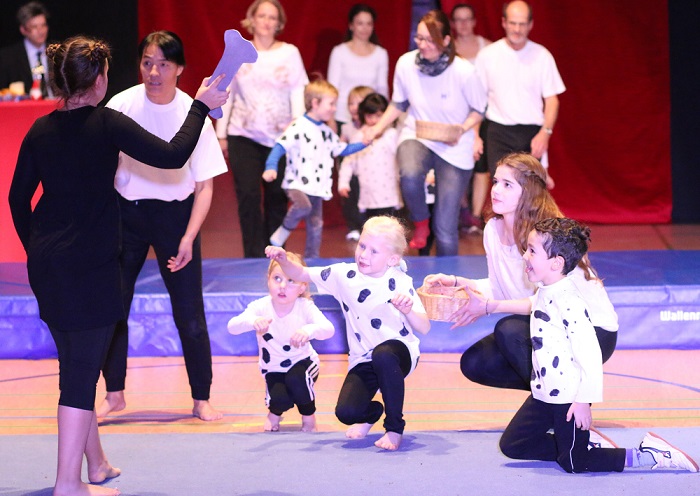 Anschließend zeigten die Vorschulkinder sowie die Buben und Mädchen der allgemeinen Turngruppe der 4-7-Jährigen ihr Können zum Thema "101 Dalmatiner". Die Kleinen präsentierten sich an Trampolin, Kasten und auf dem Balken.