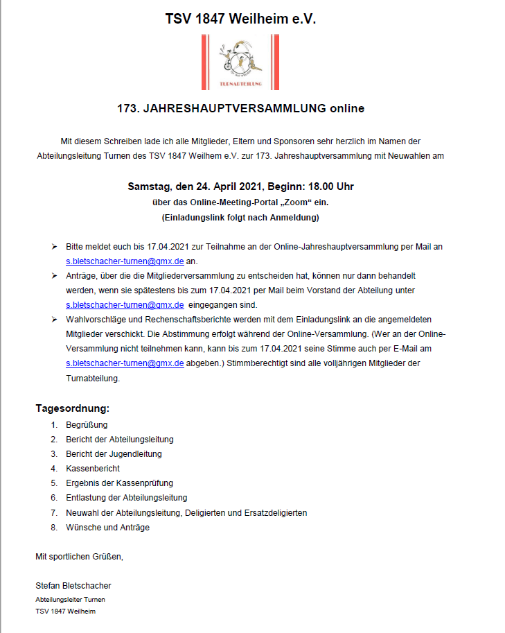 Turnen: Einladung zur 173. Mitgliederversammlung der Turnabteilung