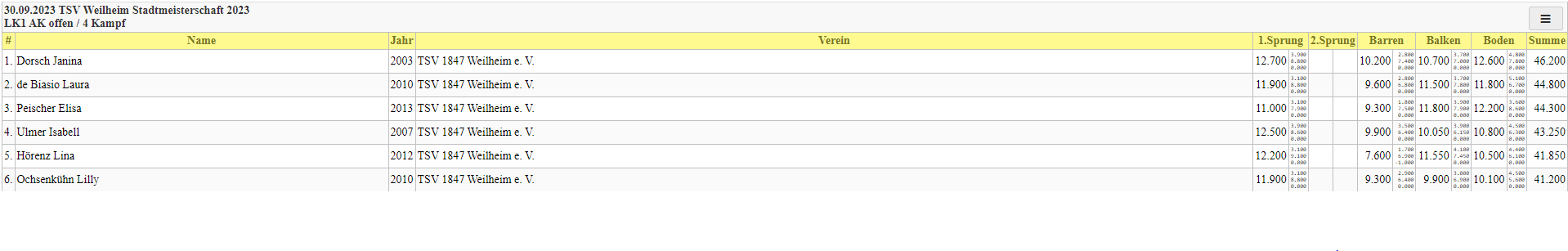 Über den Stadtmeistertitel durfte sich am Ende mit 46,2 Punkten Janina Dorsch freuen, die sich somit nach einer schweren Knieverletzung erfolgreich ins Wettkampfgeschehen zurückgekämpft hat. Auf dem zweiten Platz landete mit deutlichem Abstand und 44,8 Punkten Laura de Biasio, dicht gefolgt von Elisa Peischer mit 44,3 Punkten.