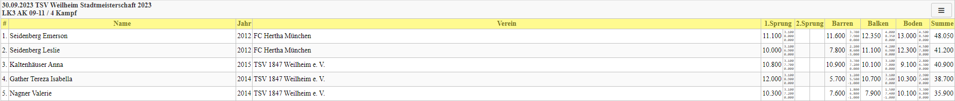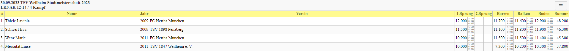 Am Samstag, den 30.09.23, fand in Weilheim in Oberbayern die Stadtmeisterschaft im Geräteturnen statt. Hierzu waren neben den Turner:Innen des TSV 1847 Weilheim auch Gäste der Vereine TV Bad Tölz, FC Hertha München und TSV 1998 Penzberg vertreten.