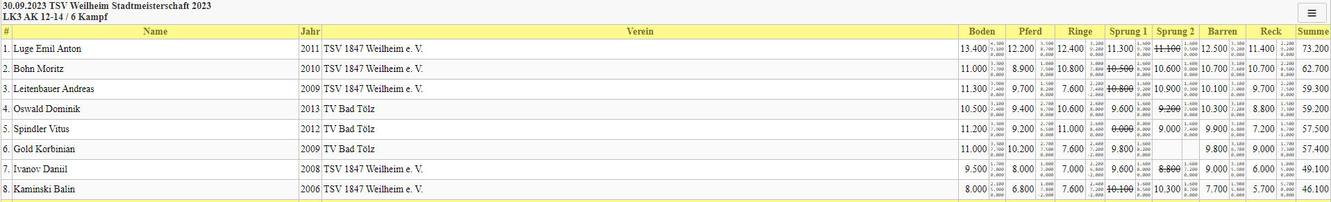 Die älteren 8 Turner traten in der Leistungsklasse 3 AK12-14 in einem klassischen 6-Kampf an, an dessen Spitze sich mit großem Abstand und 73,2 Punkten Emil Luge setzen konnte und sich somit den Stadtmeistertitel sicherte. Auf den zweiten Platz turnte sich Moritz Bohn mit 62,7 Punkten gefolgt von Andreas Leitenbauer mit 59,3 Punkten.